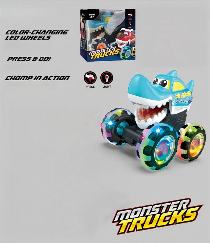 All 4 wheels flash with changing colors as it rolls. The jaw opens and closes in motion—perfect for wild, silly races.